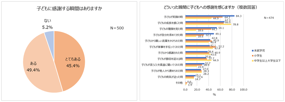 まず、子どもに感謝する瞬間があるか質問すると、4割以上が「とてもある(45.4%)」と回答。「ある(49.4%)」と合わせると、9割以上が子どもに感謝する瞬間があることが分かりました。どういった瞬間に感謝を感じるかを調べると、子どもの年齢別に異なる傾向がありました。未就学児の親は、「子どもが笑顔の時(84.3%)」が最も多く、「子どもの成長を感じた時(67.3%)」「子どもの寝顔を見た時(54.1%)」が続きました。小学生の親では、未就学児と上位は同じ回答だったものの、「子どもが家事を手伝ってくれた時(52.2%)」にも票が集まりました。中学生以上大学生以下の子どもを持つ親では「子どもの成長を感じた時(78.8%)」が最多でした。子どもの年齢が上がるにつれ、子どもの表情や動作だけでなく、行動に感謝を感じる親が多いようです。また、子どもの成長していく姿は、子どもが年齢を重ねてもずっと嬉しいものであることがうかがえました。