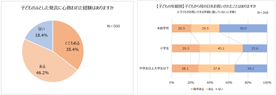 本調査では、子どもに感謝する瞬間や、力をもらった経験、心に響いた言葉などについて調査。子どもが笑顔の時や、成長が見えた時に感謝を感じること、8割以上が子どもの言葉に心救われた経験があることが明らかになりました。また、5月第2日曜日(2023年は5月14日)の母の日にちなみ、子どもから母の日のお祝いをされた経験や、もらって嬉しかったプレゼントも調査。1位は、未就学児・小学生の親は「子どもが描いた絵」、中学生以上大学生以下の子どもの親は「手紙」でした。母の日エピソードや、親バカエピソードも募ったところ、ハートフルな話が寄せられました。