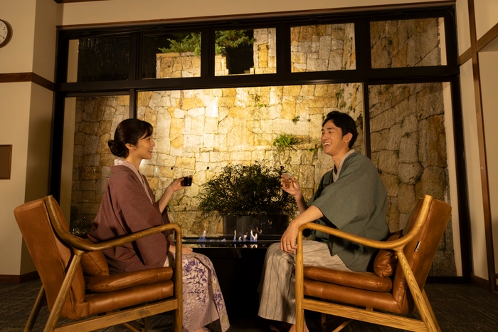 ロビーには新たにプレミアムラウンジを設置しました。お部屋の外でもゆったりお過ごしいただけるよう、各種ソフトドリンクやアルコールをご用意しています。中心には暖炉を配し、揺らぐ炎が癒しの時間を演出いたします。