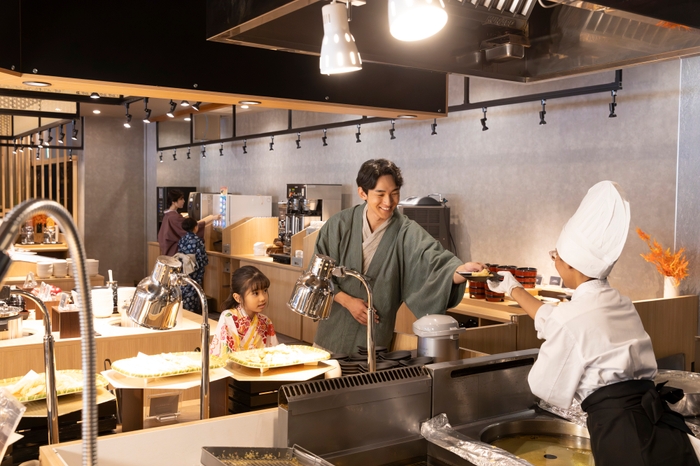 “美味しさと楽しさの融合”を目指したプレミアムな創作バイキングでは、サーロインステーキや温泉せいろ蒸しをはじめ色とりどりのデザートやソフトドリンクも飲み放題(無料)で種類豊富に揃えており、一年を通してさまざまな美味しさでおもてなしいたします。夕食時のライブキッチンではシェフ自慢の調理ショーを目の前で見ることができ、美味しさも楽しさも倍増。五感を刺激する食体験を心ゆくまでご堪能いただけます。