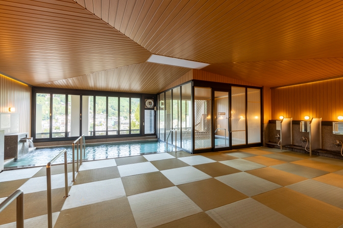 ②下呂の大自然が望める大浴場、露天風呂