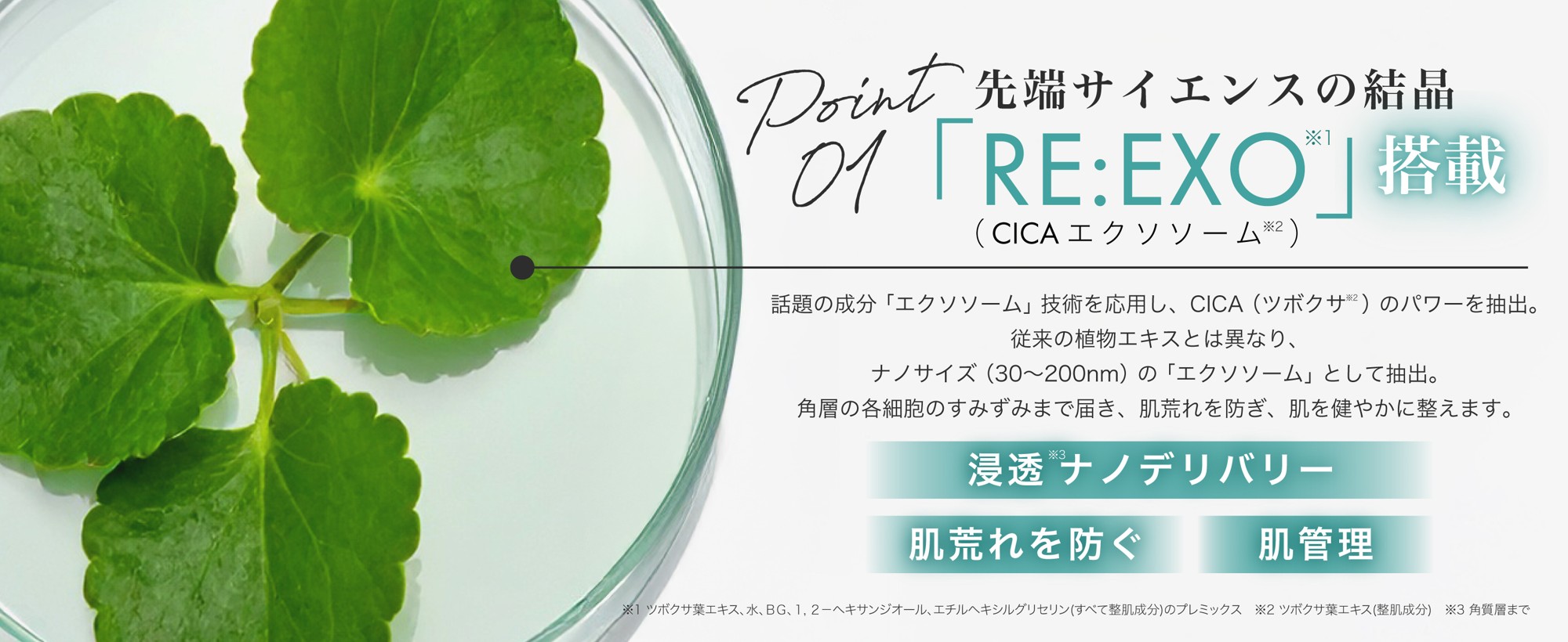 話題の成分「エクソソーム」技術を応用し、CICA(ツボクサ※5)のポテンシャルを引き出した浸透※6ナノデリバリー成分「RE:EXO」※4を配合。約30〜200nmのナノサイズ粒子が、肌※6の隅々までアプローチします。繰り返す肌荒れを防ぎ、トラブルに左右されない健やかな肌コンディションへと導く、まさに「肌管理」発想のスキンケアです。