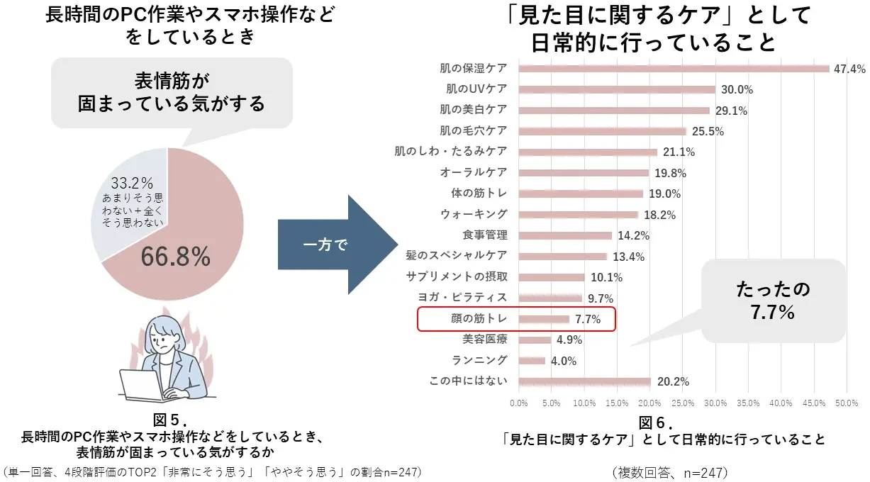 オンライン会議や長時間のPC作業が日常化する中、「表情筋が固まっている気がする」と自覚している人は66.8%(約7割)に上りました(図5.)。 にもかかわらず、日常的な「見た目に関するケア」として、豊かな表情につながる「顔の筋トレ」を行っている人はわずか7.7%にとどまっています(図6.)。スキンケアなどに比べてはるかに低く、ビジネスに必須なスキルの土台となる表情筋エクササイズが“手付かず”であることが分かりました。