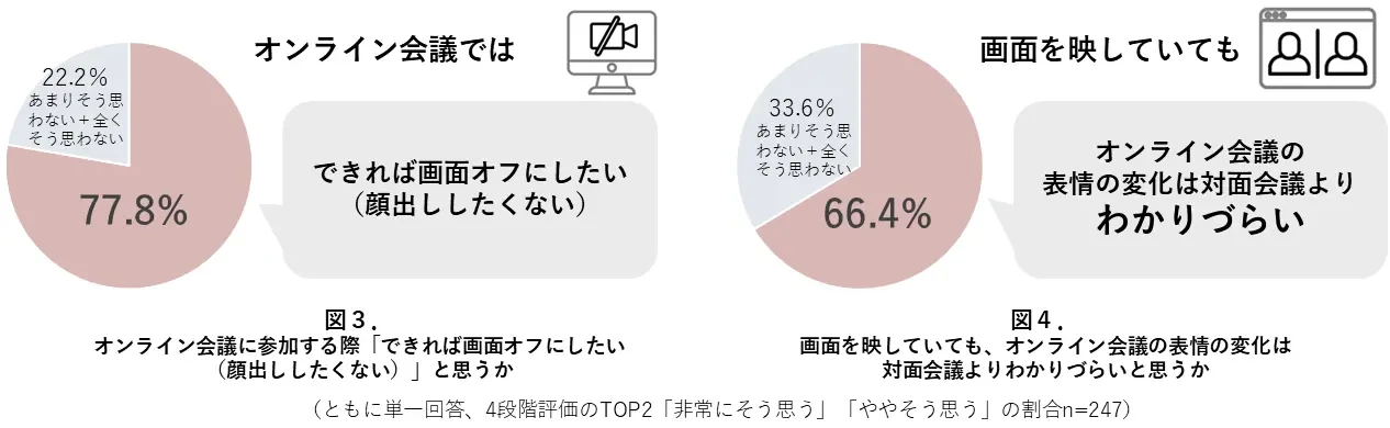 表情の重要性を理解している一方で、オンライン会議に参加する際「できれば画面オフにしたい(顔出ししたくない)」と思う人は77.8%(約8割)に上りました(図3.)。 さらに、顔を映していても、66.4%の人が「オンライン会議の表情の変化は対面会議よりわかりづらい」と感じています(図4.)。画面越しではどうしても熱意や感情が伝わりにくいため、オンライン中心の働き方においては特に、意識的に表情を豊かに動かすことが、ビジネスを円滑化するカギになりそうです。