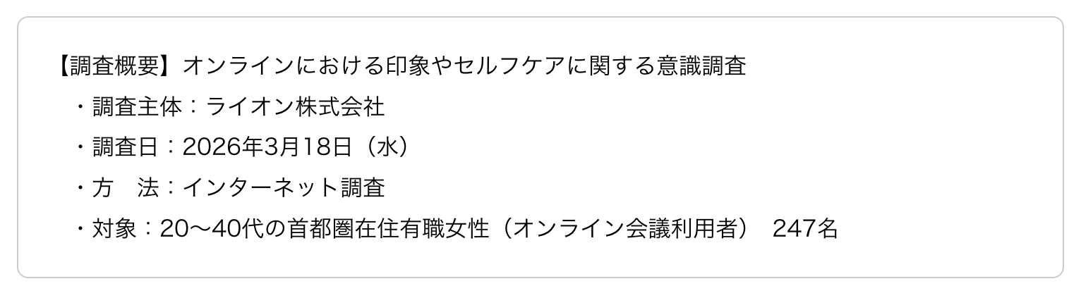 ライオン株式会社(本社:東京都台東区)は、首都圏で働く20代〜40代の女性(オンライン会議利用者)を対象に、「オンラインにおける印象やセルフケアに関する意識調査」を実施いたしました。