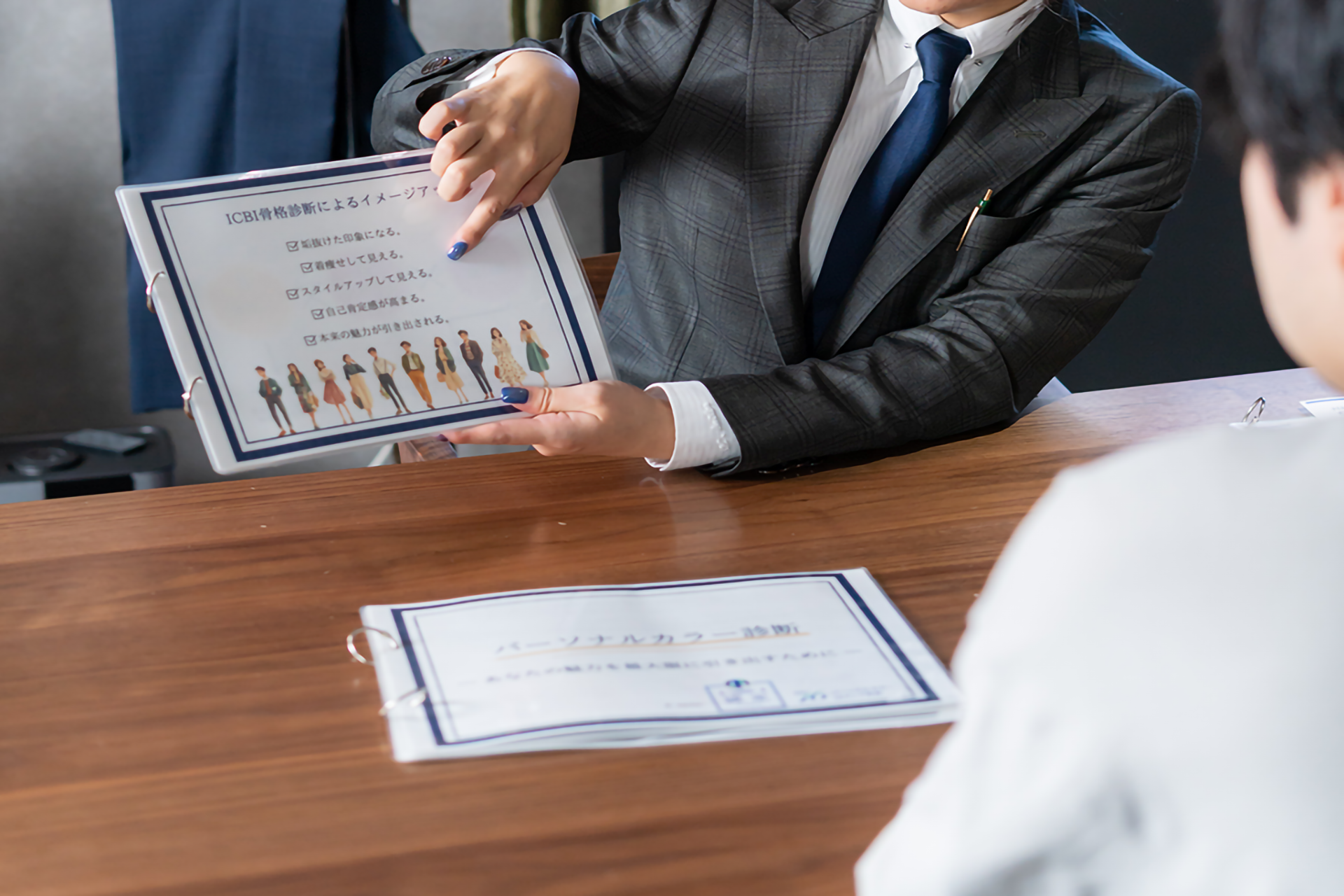 骨格診断・パーソナルカラー診断を行うことで、ロジカルにお客様にお似合いの色や生地、服の形などをお伝えします。さらに当店では、似合うだけに留まらず似合うの先にある「お客様ならではの魅力づくり」を大切にし、スーツや私服へのアドバイスを行っています。