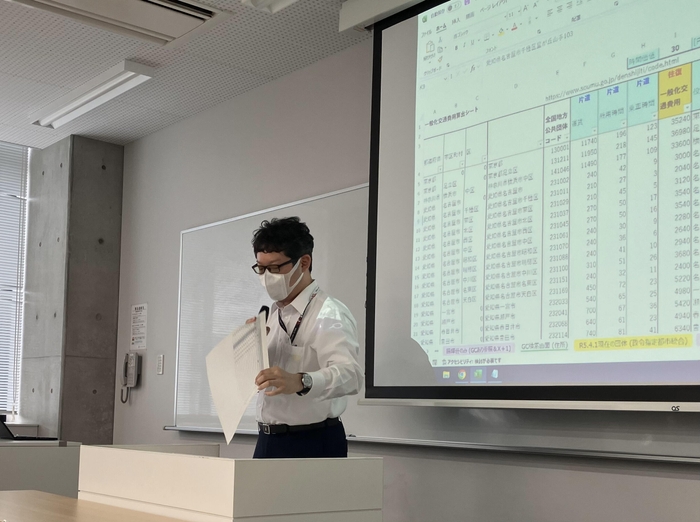 10月26日の第9回講義では、10月12日に実施した名古屋市東区の「文化のみち」エリアでのアンケート調査で収集したデータの確認、整理を行いました。大野沙知子准教授からアンケート調査データの速報が紹介された後、学生たちはアンケート調査の結果をもとに入力したデータの確認を行いました。データ分析を行うためには、入力データの形式が統一されている必要があるため、各自が入力した値をひとつひとつチェックしました。さらに、大野栄治教授と森龍太助教による需要予測調査についての講義も行われました。