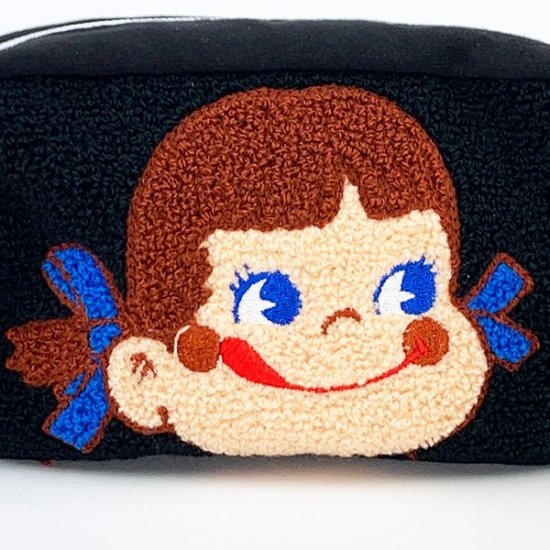 もこもこな手触りがクセになる、サガラ刺繍のポーチです。ブラックの本体に、おなじみ過ぎるペコちゃんのフェイスデザイン♡