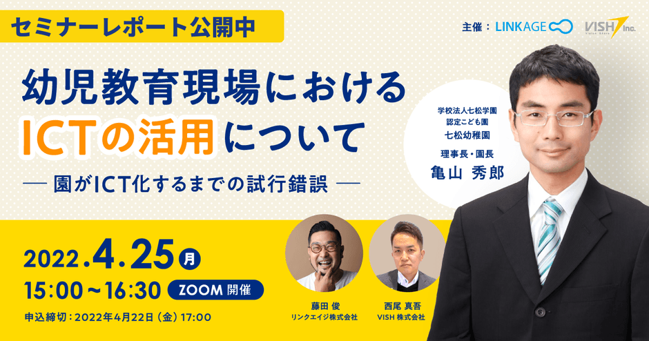 VISH株式会社(本社:愛知県名古屋市、代表取締役:田淵 浩之)は、リンクエイジ株式会社(本社:大阪府大阪市、代表取締役:藤田 俊)との共催で2022年4月25日(月)に開催したオンラインセミナー『幼児教育現場におけるICTの活用について -園がICT化するまでの試行錯誤-』のセミナーレポートを公開いたしました。