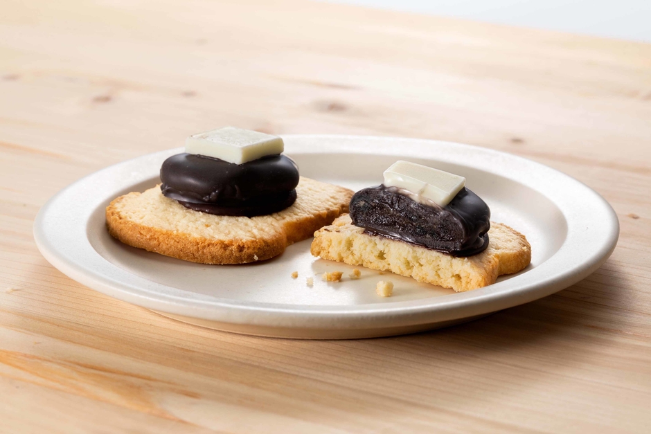 見た目はまるで小倉あんとバターをのせた“焼きたてトースト”。『珈琲所コメダ珈琲店』の小倉トーストの味わいが、おいしいサブレになりました。素材にもこだわって、北海道産あずきを使用。チョココーティングした特製小倉あんを、パン粉を練りこんだバター香るトースト型サブレの上にのせました。