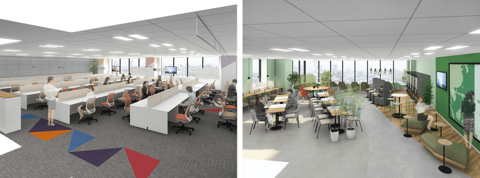 本センターでは、福岡の伝統工芸である「博多織」をモチーフとした内装デザインをはじめ、福岡エリアでの従業員の意見を反映した、ロッカールーム内の身だしなみコーナーや、休憩室にひとり席を設置するなど、働きやすさを第一に考えたレイアウトとなっています。また、新型コロナウイルス感染症対策として、体温を自動測定できるサーマルカメラをはじめ、ソーシャルディスタンスおよび非接触を考慮し、全席への飛沫防止パーテーションや、消毒液スタンドなどの設置を行います。