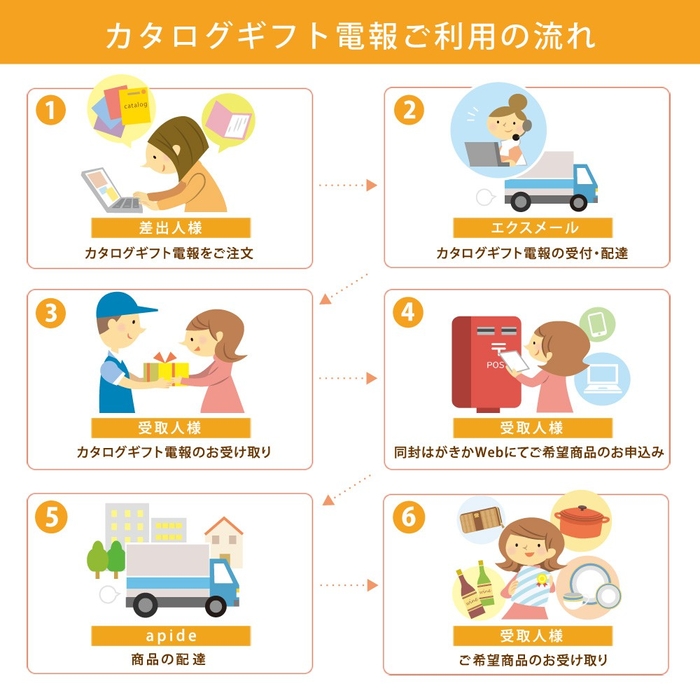 注文は、電報屋のエクスメールの公式ウェブサイト、もしくはカタログギフト電報の特集ページから簡単に行えます。メッセージ文例も多数用意されているので、電報の申込みに慣れていない方でも安心。贈る相手の住所を指定するだけで、電報とカタログギフトを一緒にお届けします。