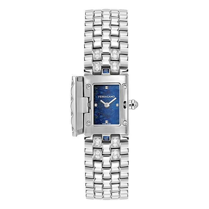 ● ケース: 長方形 18x30mm ● ムーブメント: クオーツ2針 (ロンダ1032) – スイス製 ● ダイアル: 4バージョン: ラピスラズリ/マラカイト/赤メノウ/マザーオブパール ● ブレスレット: 2バージョン:ダイヤモンド32個(0.96ct)とスクエアカットのブルーサファイアかエメラルドかルビー付きスティール/ダイヤモンド188個 (0.85ct)付きスティール – Ferragamoロゴ入りバタフライバックル ● 防水: 30メートル