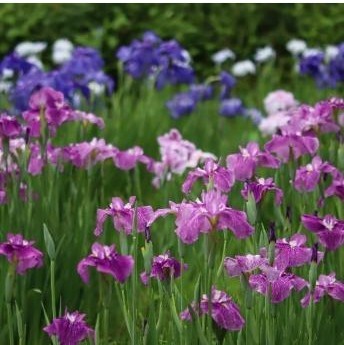 ③ 水生植物園では、5月上旬からアヤメやカキツバタが、下旬にはハナショウブが開花します。花菖蒲田に植えられた約50品種1,500株のハナショウブを堪能。