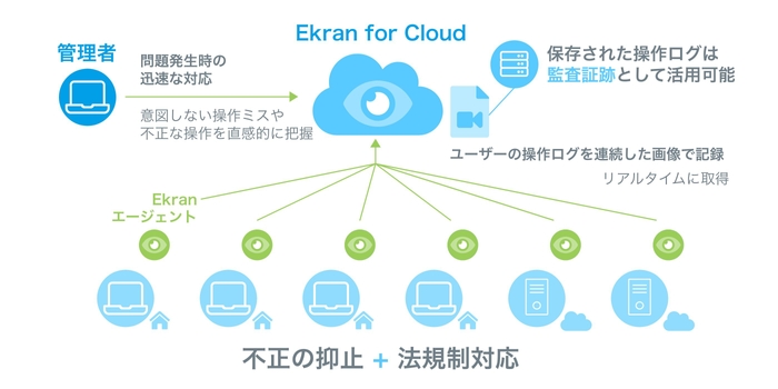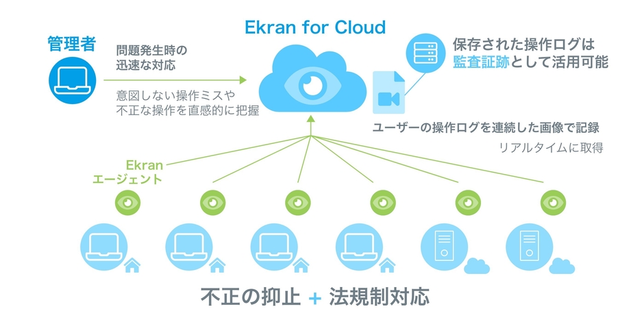 EkranはPC、サーバーの操作を画像とテキストで記録するソリューションです。ユーザーのログインからログアウトまでの操作を記録しますので、昨今のテレワークのニーズにも対応可能です。
