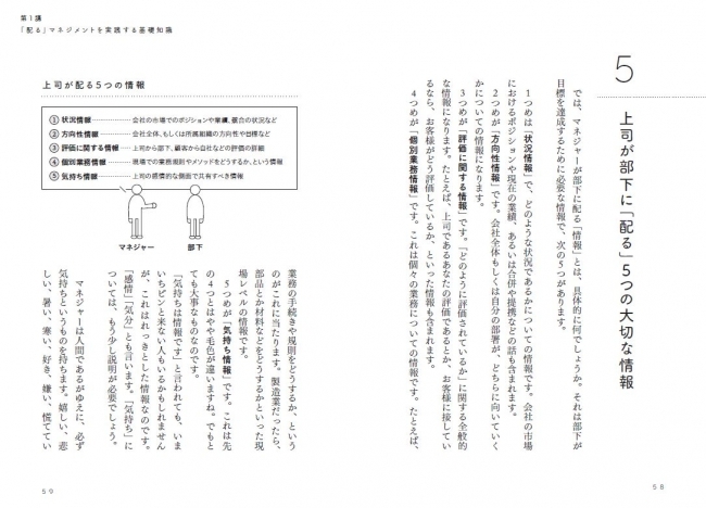 「配る」ものは、大きく5つあります。それは、「状況情報」「方向性情報」「評価に関する情報」「個別業務情報」「気持ち情報」です。本書ではこれらひとつひとつを丁寧に解説していきます。