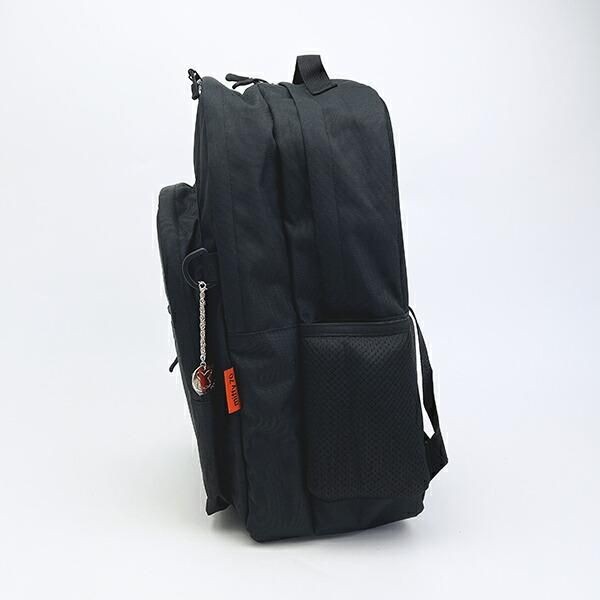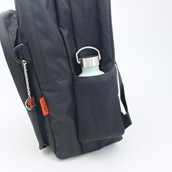 サイドには500mlペットボトルを入れられるメッシュサイドポケット付いています。バックパック側面にはDカンが付いており、前面にはキーホルダー等を引っ掛けることのできるキーホックもついています。よこからちらりと見えるナインチェのチャームにもキュンとしてしまいます。