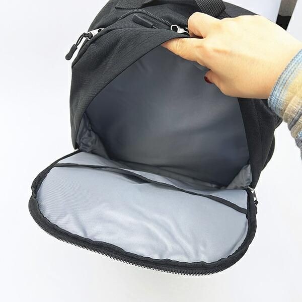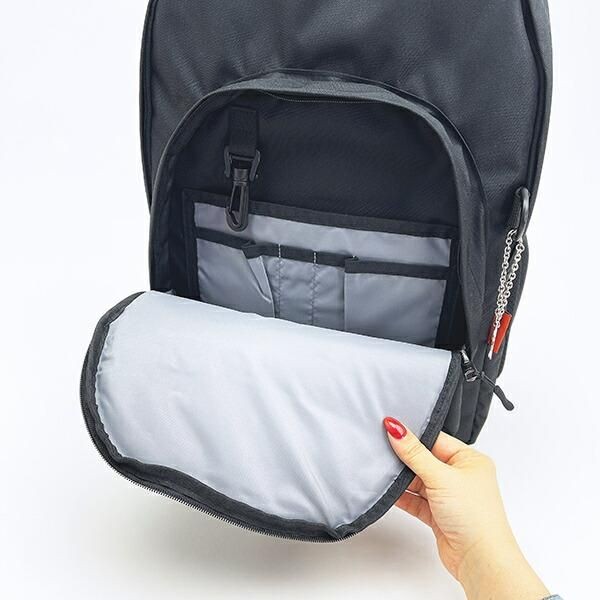 メイン収納は2ルームに分かれており、荷物を仕分けして収納することが可能です。30Lの大容量で収納力抜群です。A4サイズのノートもすっぽり収納でき、ノートPCやタブレットを入れるのに便利なクッションポケットも付いているのでスクールリュックやデイリーバッグとしてもおすすめです。背面部分はメッシュとクッションで背負い心地も快適なのでずっと背負っていても不快になりにくいです。サイズ:44cm×32cm×17cm 素材:本体:ポリエステル、ストラップ:PVC