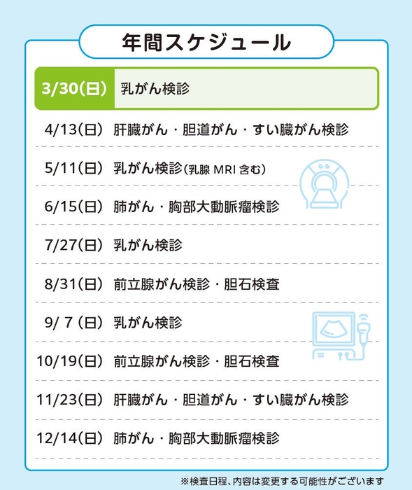 私どもは、がんや心臓病・脳卒中といった生活習慣病の早期発見と治療へ繋がる第一歩である「検診」の重要性を広く周知し、身近なものとする啓発活動を推進いたします。一人でも多くの方の健康寿命延伸のため、通年スケジュールで週末検診イベントを開催しています。