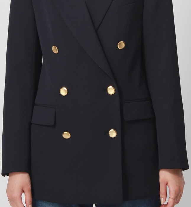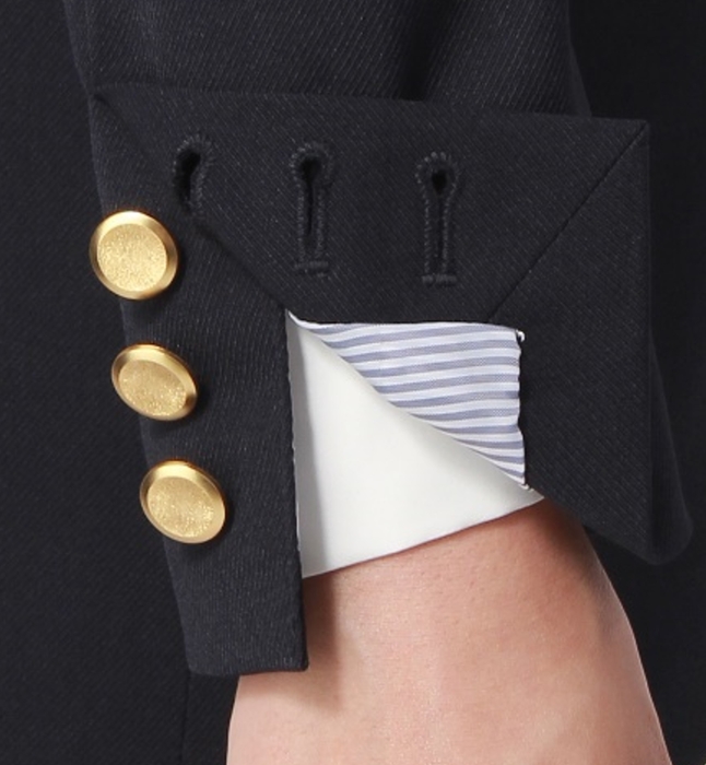 今回発売するネイビーブレザーは、クラシックな6つボタンダブルで、トレンドに合わせヒップが隠れるやや長めの着丈に、ゆったりとしたボックスシルエットが特徴です。艶感を抑えた無地のシンプルな金ボタンを採用し、ビジネスでも使いやすい落ち着いた雰囲気に仕上げています。また、フロントボタンの位置を少し高めに設定することで、視線が高くなりスタイルアップ効果を演出するなどこだわりのあるブレザーに仕上げています。