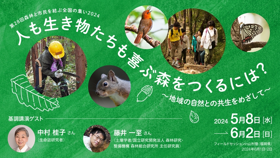 「森林と市民を結ぶ全国の集い2024」実行委員会は、公益社団法人国土緑化推進機構との共催で、「人も生き物たちも喜ぶ森をつくるには?~地域の自然との共生をめざして~」をテーマにしたイベントを開催いたします。