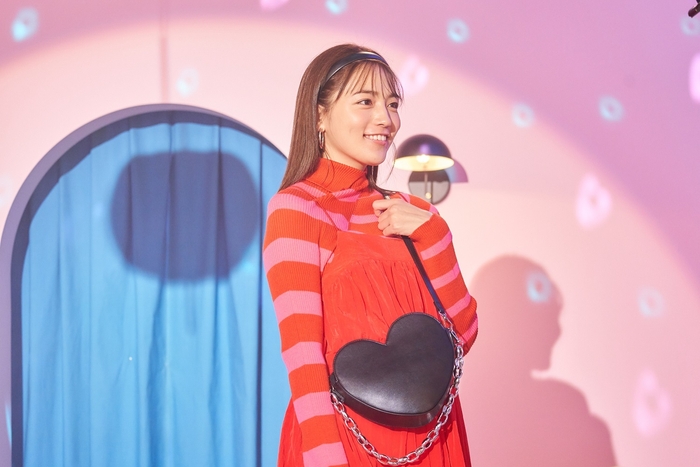 まずは、赤のワンピースにハートのバッグを持ったガーリー系ファッションで登場した川口さん。監督とのCM撮影打ち合わせの際に見せた真剣な表情から、カメラが回るとファッションやPOPなカフェのセットに合わせ笑顔に切り替える姿はさすがプロ。そして、決めポーズから後ろにある階段にかっこよく登るシーンの撮影では、立ち位置や階段を上る際の歩数など、細かな動きまで監督に相談する様子も見られました。