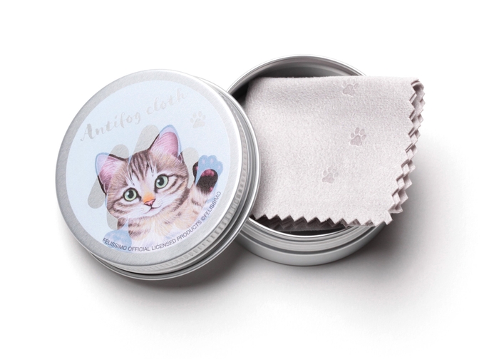 メガネのレンズを拭くだけでくもり止め効果が発揮されるドライクロスです。スプレータイプとは違い、短時間で簡単にくもりを抑えることができます。クロスの端にはいたずらに猫の足跡がついています。チャシロ、ハチワレ、キジトラ3種の子猫の缶ケースが付属しており、クロスの乾燥防止用としてご使用いただけます。