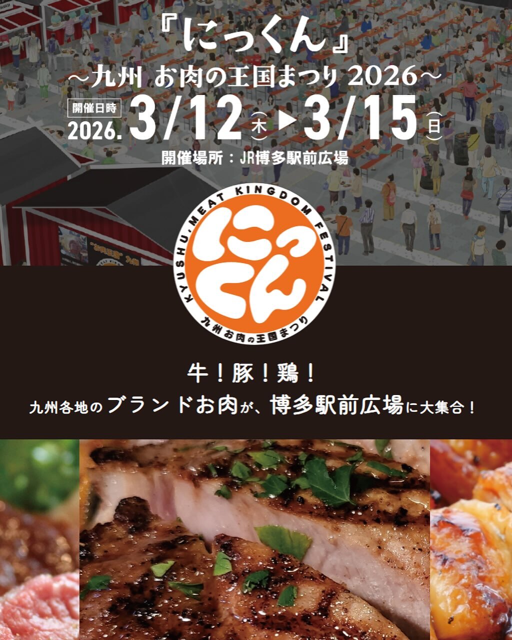 一般社団法人九州観光機構(会長:唐池 恒二)が中心となり構成する にっくん九州お肉の王国まつり実行委員会(委員長:唐池 恒二)は、『にっくん』~九州 お肉の王国まつり2026~(以下、本イベント)を、3月12日(木)~3月15日(日)の4日間、JR博多駅前広場で開催します。今回2回目の開催となる本イベントでは、九州7県のブランドお肉(牛・豚・鶏)を使用した20店がJR博多駅前広場に再び集結します。また今回は2月15日(日)から福岡市内の飲食店を対象にしたキャンペーンも実施します。