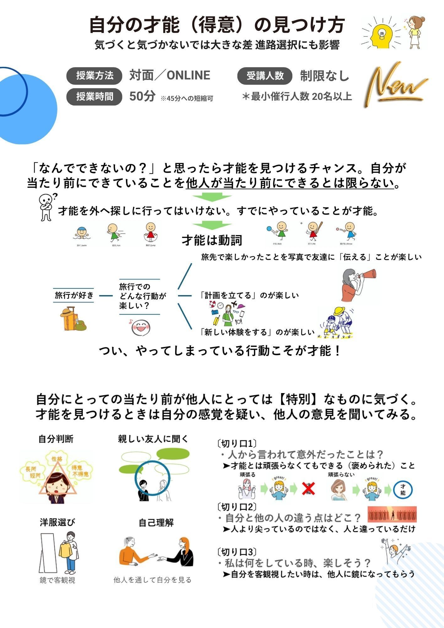 新授業『自分の才能(得意)の見つけ方』は、中学生や高校生の時に自分の才能(得意)に早く気づき、その才能を生かせる進路選択をし、社会へ出て、自らの才能を遺憾なく発揮する人をつくりたいという思いから作った授業です。