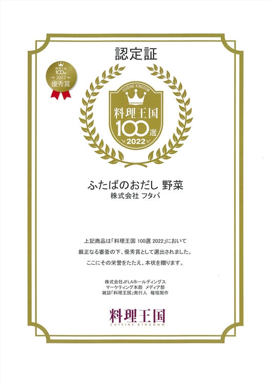 創業68年、出汁パックの製造販売を行う株式会社フタバ(代表取締役社長:江口 晃、本社:新潟県三条市)が展開する、新ブランド「ふたばのおだし」の商品『ふたばのおだし 野菜』が料理王国100選2022の優秀賞を受賞いたしました。