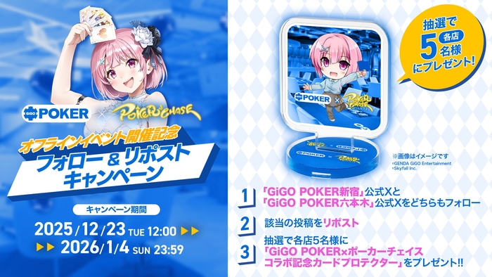株式会社GENDA GiGO Entertainment(本社:東京都港区 代表取締役社長:二宮 一浩、以下「当社」)は、株式会社Skyfall(本社:東京都港区 代表取締役社長:長谷川 智一、以下「Skyfall」)が運営するバトロワ式オンラインポーカーゲーム『ポーカーチェイス』とのコラボレーションイベントを、「GiGO POKER新宿」と「GiGO POKER六本木」で2026年1月16日(金)~2月28日(土)の期間で開催いたします。
