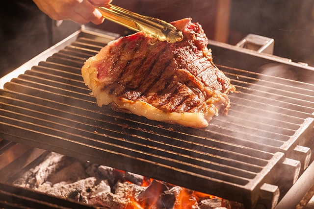 また、大きなTボーンを最高に美味しい状態で提供するべく、海外メーカーの協力のもと、特注のチャコールグリルを作成。焼き上げる過程で滴り落ちる肉の脂が炭に落ち、煙をあげることで燻す効果が生まれ、ほどよい炭の香りが肉の美味しさをさらに引き立たせる。