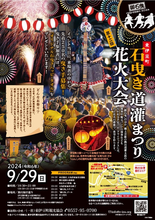 石曳道灌まつり花火大会では夜の熱川温泉の海岸通りにて江戸城の石垣にも使われた12tもの重さの伊豆石を祭りの参加者で運び出す祭典となっています。