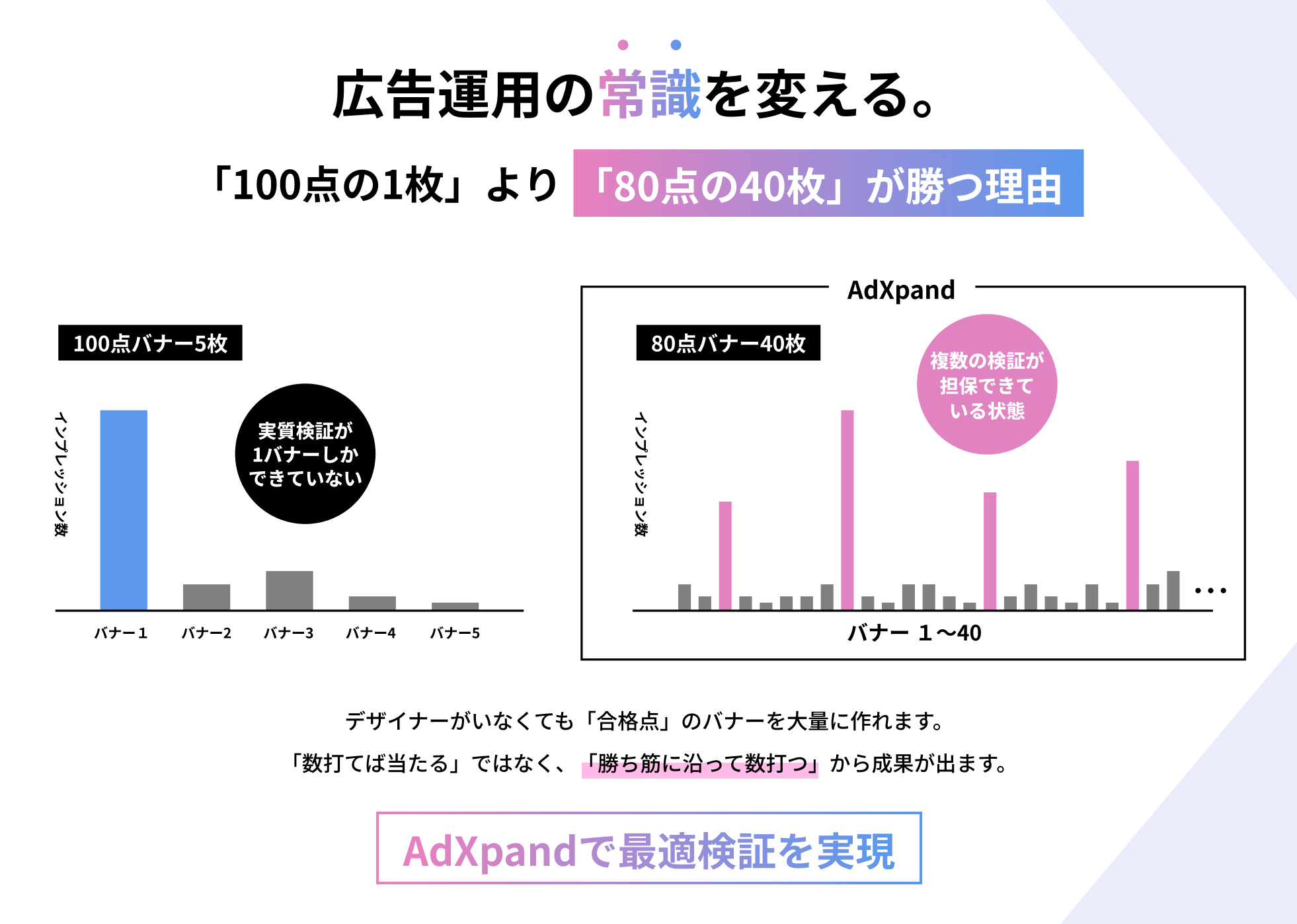 バナーを作るだけで、勝てる運用パターンをシステムが勝手に再現し、成果を爆発的に伸ばすサイクルを構築します。