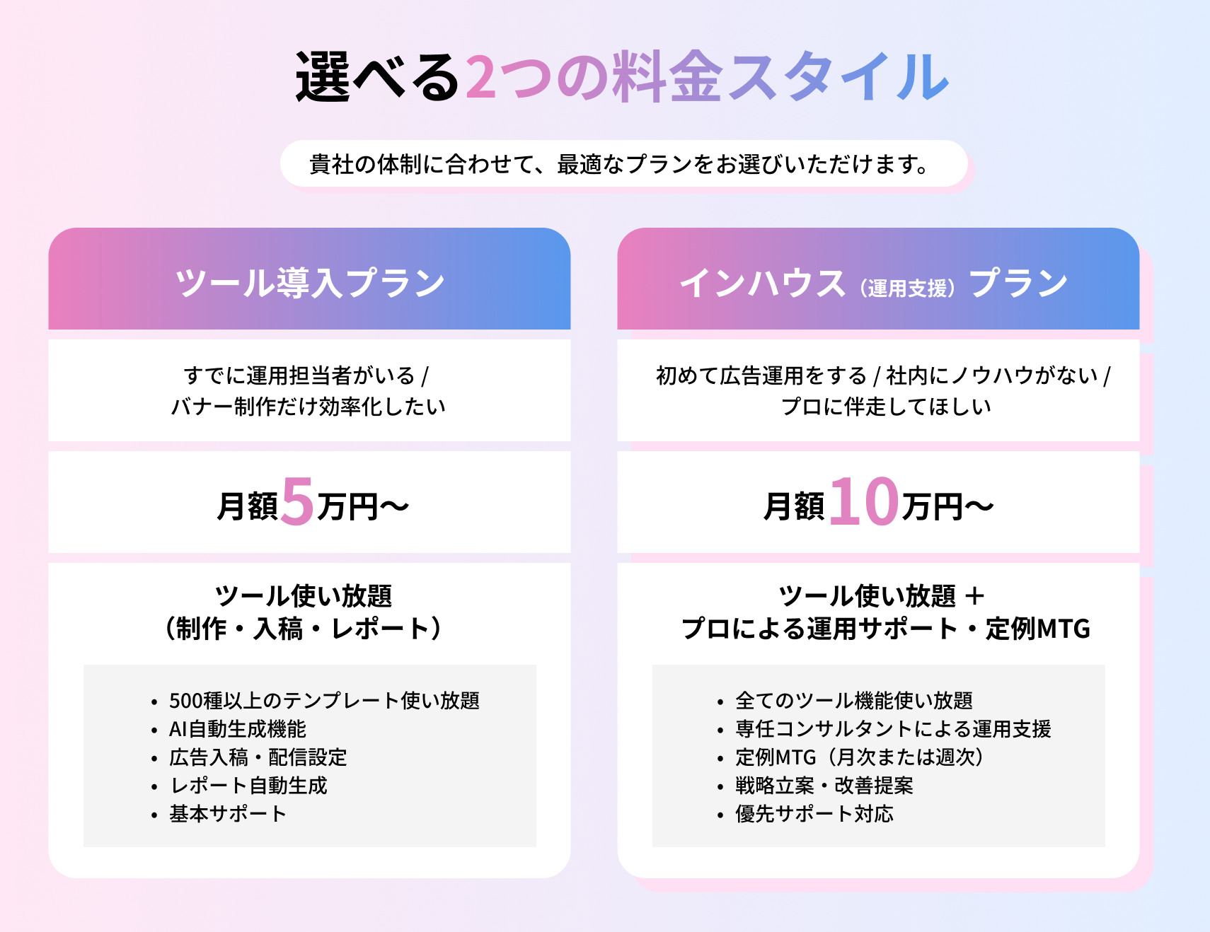 AdXpandのインハウス支援は、企業のフェーズや課題に合わせて柔軟に組み合わせ可能な料金体系をご用意しています。「まずはバナー制作だけ自動化したい」「運用・精査だけ任せたい」といった部分的な利用も可能で、ミニマム月額5万円から手軽に導入いただけます。
