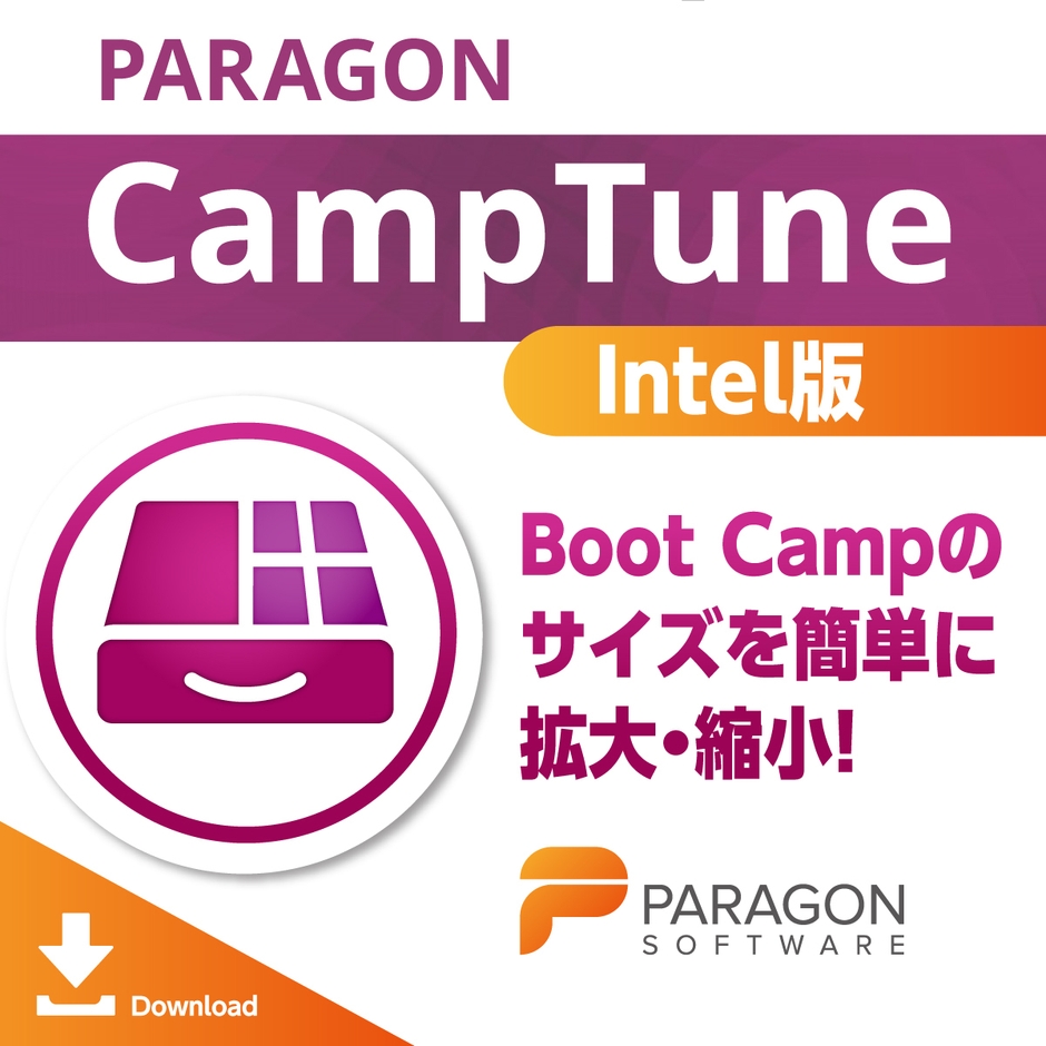 Paragon CampTuneは、macOSのユーティリティではサイズを変更できないBoot Camp(Windows)ボリュームのサイズを変更できる製品となります。インストールした製品のスライダーを左右するだけの簡単操作でBoot Campの再セットアップなどを行うことなくmacOSとBoot Campに割り当てるボリュームのサイズを簡単に変更できます。標準価格は、税込4,200円となります。また販売はダウンロード版のみとなります。