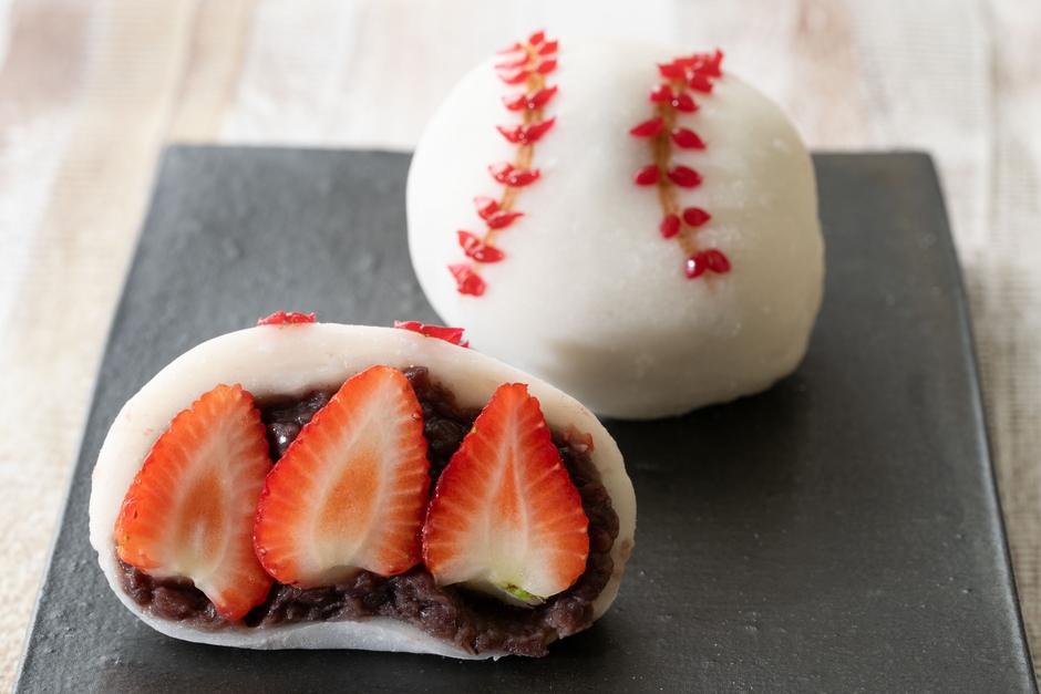 販売する度に、毎回完売御礼の大ヒット商品「ジャンボ大福シリーズ」が今年、2年ぶりに復活します!2024年はワールドシリーズを制覇した日本人メジャーリーガーの皆さんに大きなパワーをもらった一年ということで、その活躍にあやかった「開運ジャンボホームラン大福」を考案。自慢の「元祖いちご豆大福」をベースに、羊羹とニッキでボールの縫い目を再現したジャンボサイズの大福は、硬式球とほぼ同じサイズを目指して創作しました。当店常連の「西銀座チャンスセンター」の販売員の皆様をはじめ、この商品を召し上がる多くの方々に、特大ホームラン級の福が舞い込んでほしいと願っています。