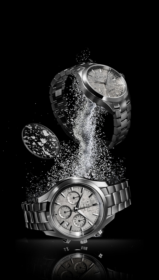 文字盤は一番目に触れる場所ですが、装飾が華美になると視認性が低下します。シンプルな意匠にしつつも素材の美しさを表現したい、というKnotのデザイナーと試行錯誤を繰り返し、最終的に採用となったのは「プラチナ箔」でした。プラチナ箔をフレーク状にした「切り廻し」を散りばめることで、箔の重なりが繊細な表情となって表現されています。また、ムーブメントの動きが見えるシースルーバックの三針タイプには、「散らし技法」が採用されています。こちらはサンプルを検討する段階で、箔一の実績であるゲラン社の香水ボトルやグラスウェア「Stardust」などにヒントを得てガラス素材との相性の良さが認められ採用となった技法です。