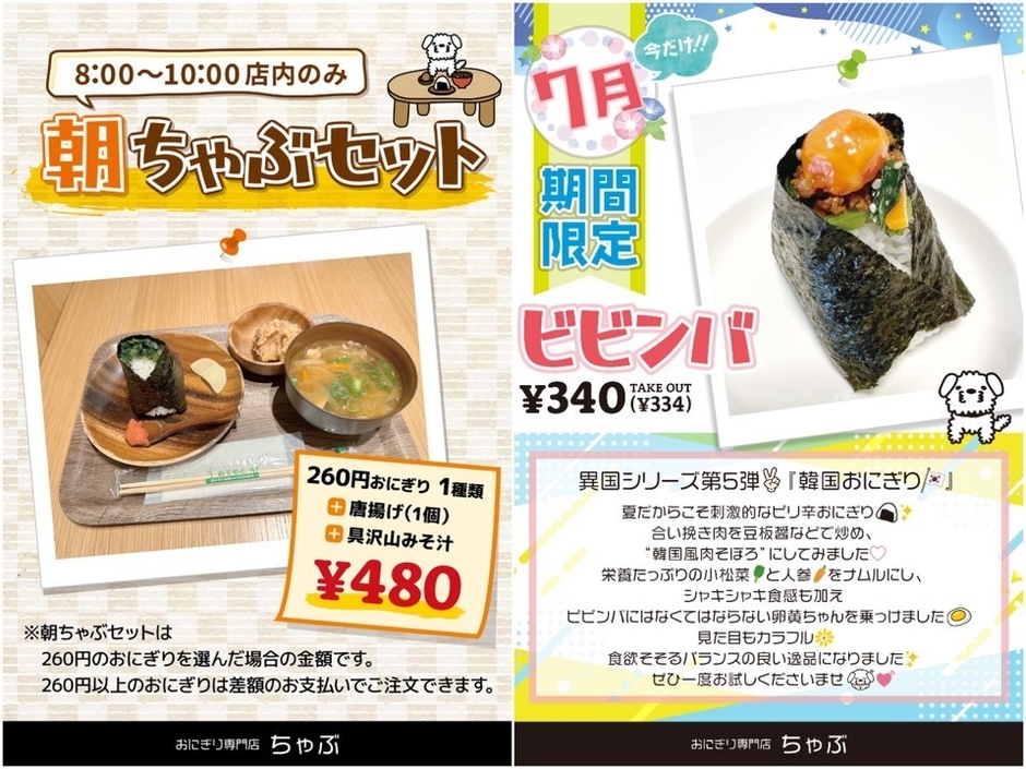 柏駅で朝食を。おにぎり専門店ちゃぶ、 新メニュー「朝ちゃぶセット」&7月限定「ビビンバおにぎり」 7月1日(土)より発売