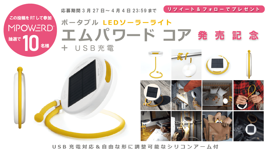 エムパワード コアは小型のLEDライトに約35cmのシリコンアームがついた、新しいタイプのLEDソーラーライトです。直径約10.1cm、厚さ約3cmのコンパクトなボディで最大照度40ルーメン、最長12時間の連続点灯ができます。シリコンアームは容易に変形させることができ、自立、本体のみでの吊り下げ、固定など、様々な場面でご使用いただけます。充電方法は太陽光充電とUSB充電の2通り。防水なので災害時にも安心してご使用いただけます。