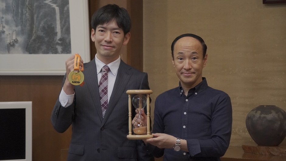 会談では、サハラマラソンに挑戦することになった経緯、この1年取り組んできた準備や国内レースへの参加について、サハラマラソン中に感じたこと等をお話しし、持ち帰ったサハラの砂で作った砂時計を寄贈しました。