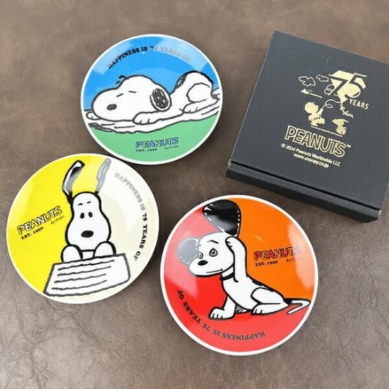 さすが75周年。どのアイテムもデザイン性が抜群です。豆皿が入っている箱でさえ75周年記念使用のデザインで開ける前からテンション爆上がりです。3種類展開でそれぞれイラストが違うので揃えてコレクションするのもおすすめですよ。皆様もこの機会にぜひ、スヌーピーのアイテムでスヌーピーと一緒に75周年をお祝いしませんか?