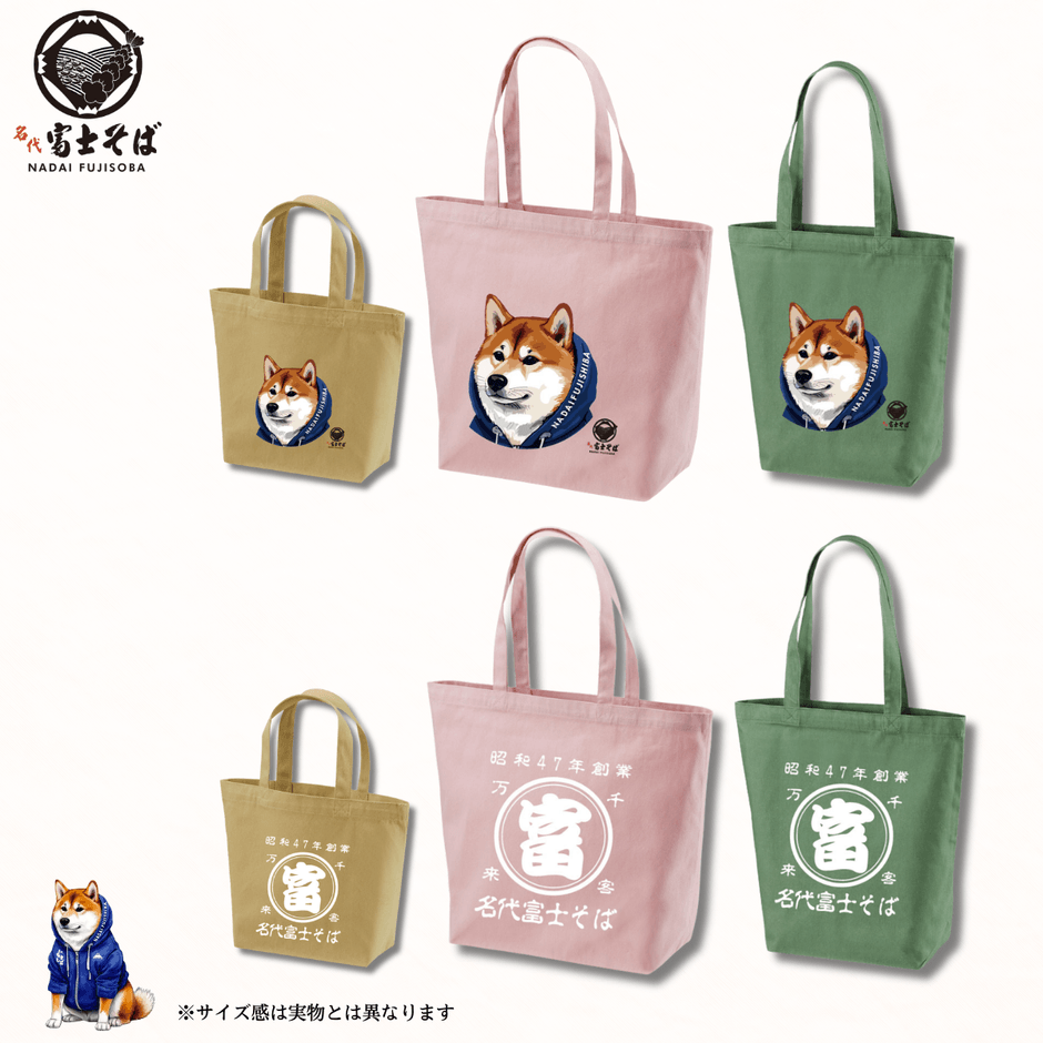春らしいカラーで展開するトートバッグは、オフピンク・アシッドカーキ・リーフグリーンの3色をご用意しています。デザインは「名代富士しば顔アップ」と「帆前掛け風」の2種類。普段使いからお出かけまで幅広い場面で活躍します。S・M・Lの3サイズ展開で、用途に合わせて選べます。