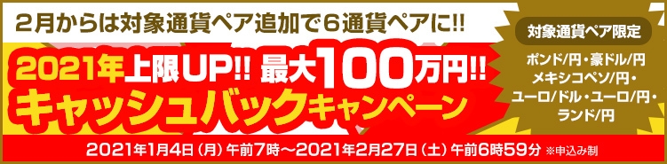 本キャンペーンでは、キャンペーン期間中における外国為替保証金取引(FX)『選べる外貨』での新規取引数量に応じて、最大1,000,000円をキャッシュバックいたします。2月からは相場変動が期待できる3通貨ペア、ユーロ/ドル、ユーロ/円、ランド/円を新たに追加して、ポンド/円、豪ドル/円、メキシコペソ/円と合わせた6通貨ペアが本キャンペーンの対象通貨ペアとなります。ぜひこの機会に『選べる外貨』でのお取引をご検討ください。