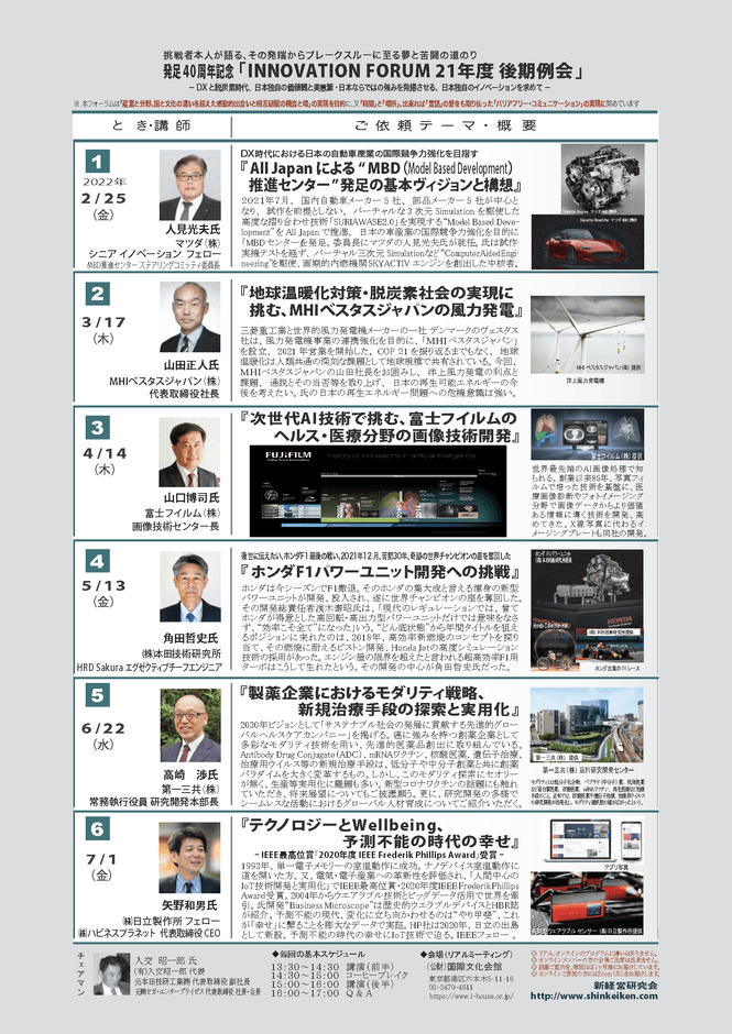 今年40周年を迎える日本の技術系幹部の相互研鑽の集まり「新経営研究会」(代表:松尾 隆)が主催する、「イノベーションフォーラム(月例会で1期6回)」の2021年度後期プログラムを東京六本木の「国際文化会館」にて2022年2月25日よりスタートいたします。