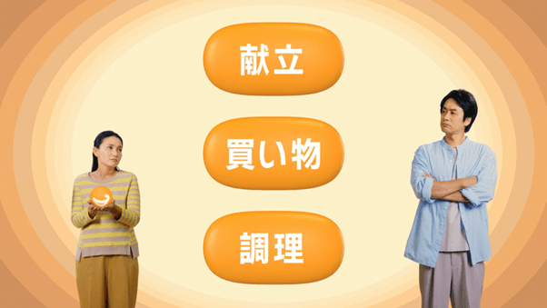 ・狙い:毎日必ず食べる「夕飯」は献立づくり、買い物、調理、洗い物など、何かと手間がかかります。手作りのおかずが届く「つくりおき.jp」なら、それらの家事をなくして夕食の準備を5分で完了できます。当たり前のこととして積み重ねていた日々の負担を簡単に減らせることを夫婦の軽快なアクションで表現しました。