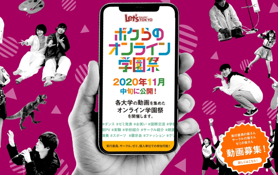 今後、11月中旬に学生の皆さんが作った動画を集めて紹介する「ボクらのオンライン学園祭」の正式オープンのほか、12月中旬にはサイト内で行われる「参加型オンラインイベント(1日限定)」 も予定しています。学生の皆さんには、学園祭実行委員の取り組みや、学園祭で実施予定だったサークル活動、学術発表などの動画を制作していただき、特設サイト内で様々なカテゴリに分けて特集し全国へ発信します。