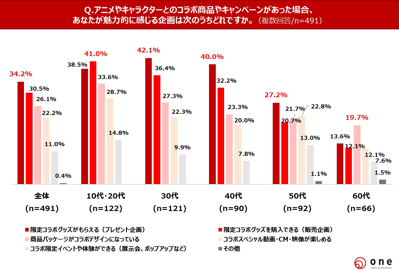 年代別で見ると、10代・20代は「限定コラボグッズを購入できる(販売企画)」が41.0%で最も高く、推し活の一環としてお金を使いたい、もしくは確実に手に入れたいという意識が強いのかもしれません。60代は「商品パッケージがコラボデザインになっている」19.7%が最多でした。食品や日用品のような消費財のパッケージがコラボデザインになっていると手に取りたくなるようです。
