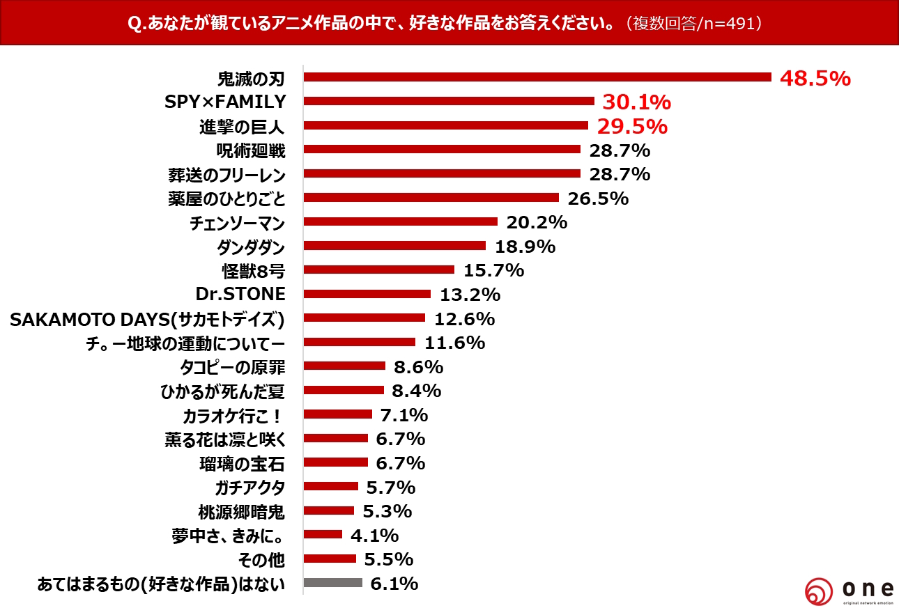 Q3. あなたが直近で観ているアニメ作品の中で好きな作品をお答えください。(複数回答/n=491)