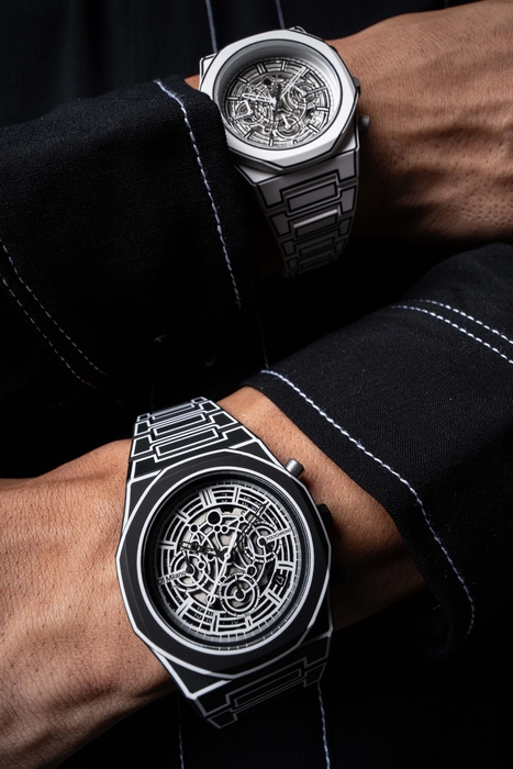 トーン・オン・トーンのスケルトンダイヤルが奥行きをつくり、構造そのものがアートとして立ち上がる。